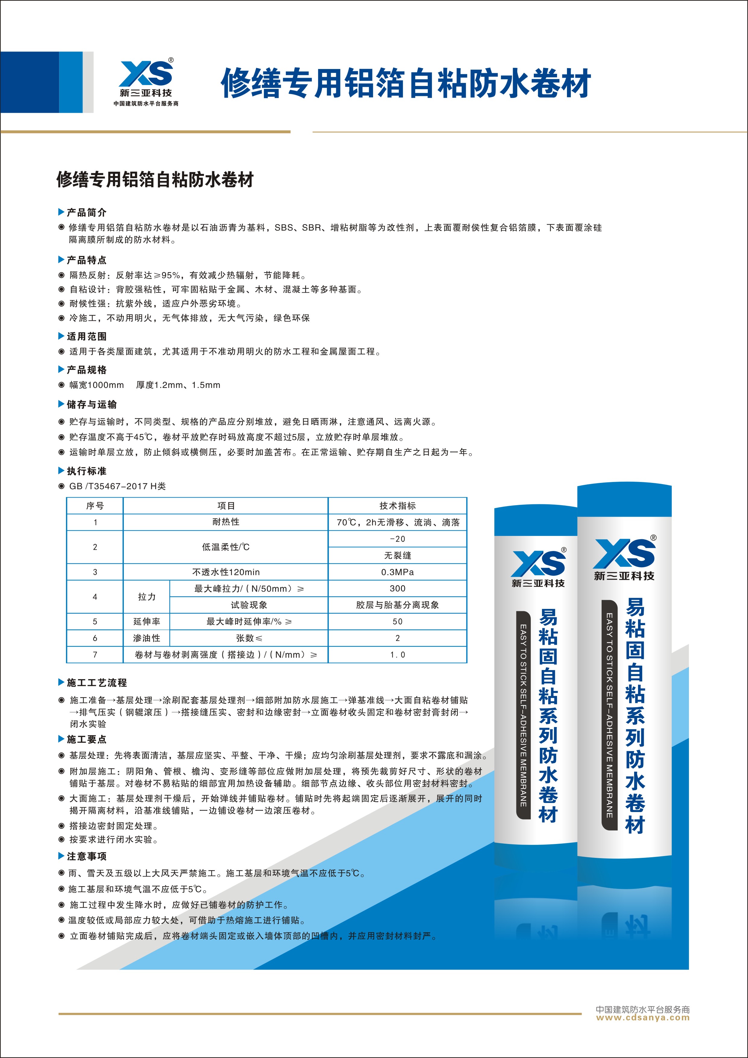 修繕專用鋁箔自粘防水卷材以石油瀝青為基料,SBS、SBR、增粘樹脂等為改性劑,上表面覆耐侯性復(fù)合鋁箔膜,下表面覆涂硅隔離膜所制成的防水材料。